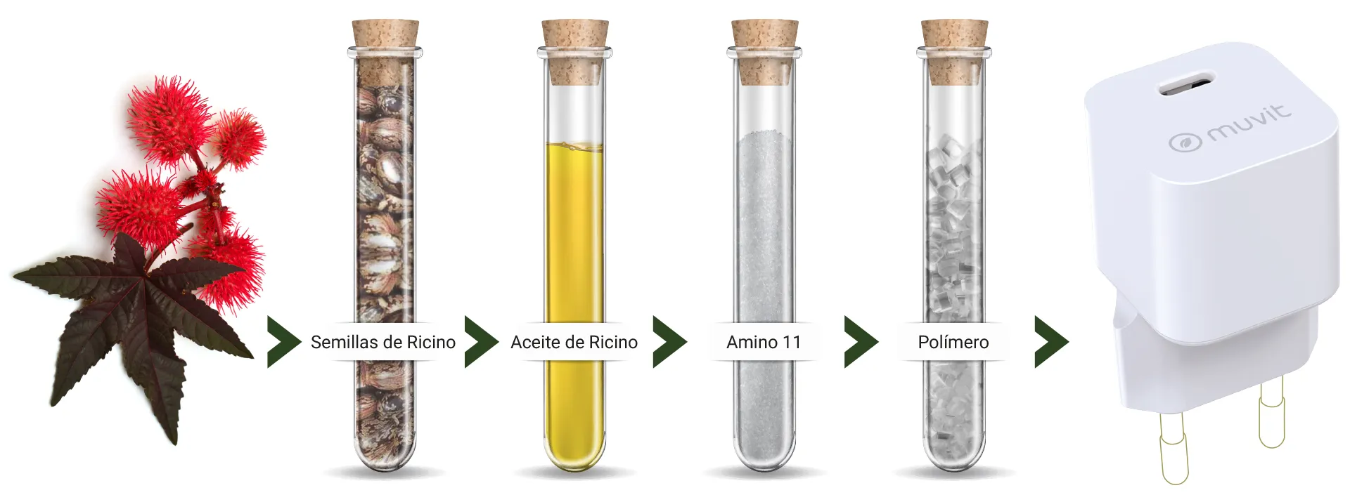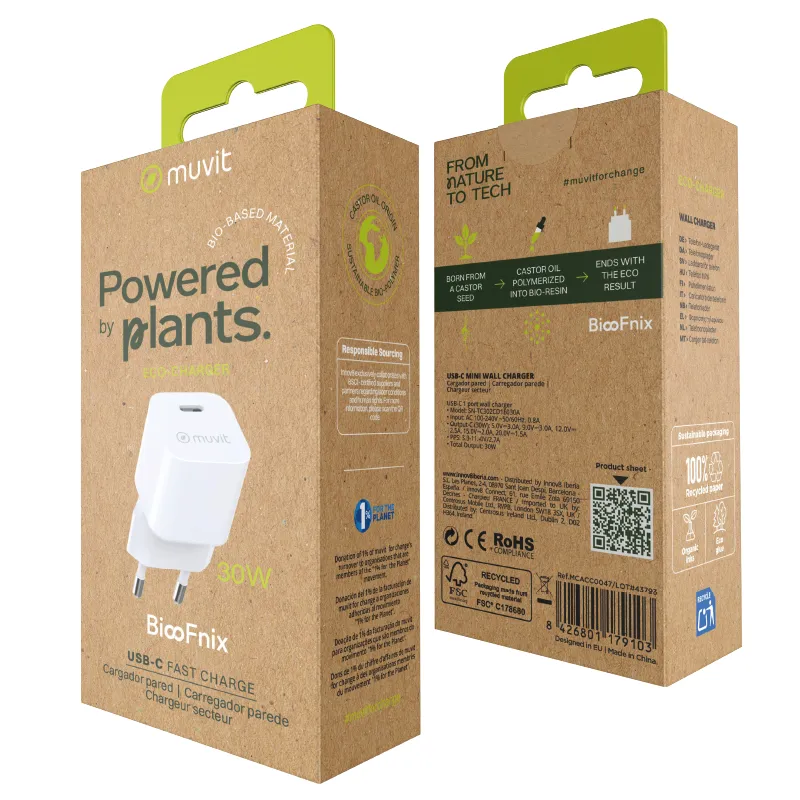 El futuro de la tecnología es sostenible. Presentamos BiooFnix®, nuestro nuevo cargador con una carcasa fabricada a partir de un innovador polímero de origen vegetal. A diferencia de los materiales plásticos convencionales, este material revolucionario se obtiene de semillas de ricino, cultivadas de forma responsable. Con BiooFnix®, demostramos que es posible crear accesorios de alto rendimiento que respetan el medio ambiente, reduciendo la huella de carbono y el uso de recursos derivados del petróleo.