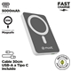 Batería externa de 5000 mAh de color negro de muvit for change. Esta Power Bank dispone un 1 puerto USB y la opción de carga inalámbrica imantada compatible con magsafe de 15W de potencia y está fabricada con materiales reciclado de origen certificado RCS - RECYCLED CLAIM STANDARD. y batería de polimero li-ion. Incorpora un cable USB-C de 30 cm de TPE reciclado.
